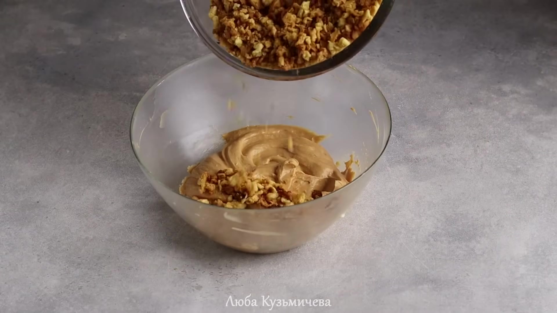 - Kırıntıların krema ile karıştırılması. Derin bir kapta, tart kırıntılarını krema ile birleştirin. Karışımı bir spatula (veya eldivenli eller) ile her kırıntı krema ile kaplanana kadar iyice yoğurun.